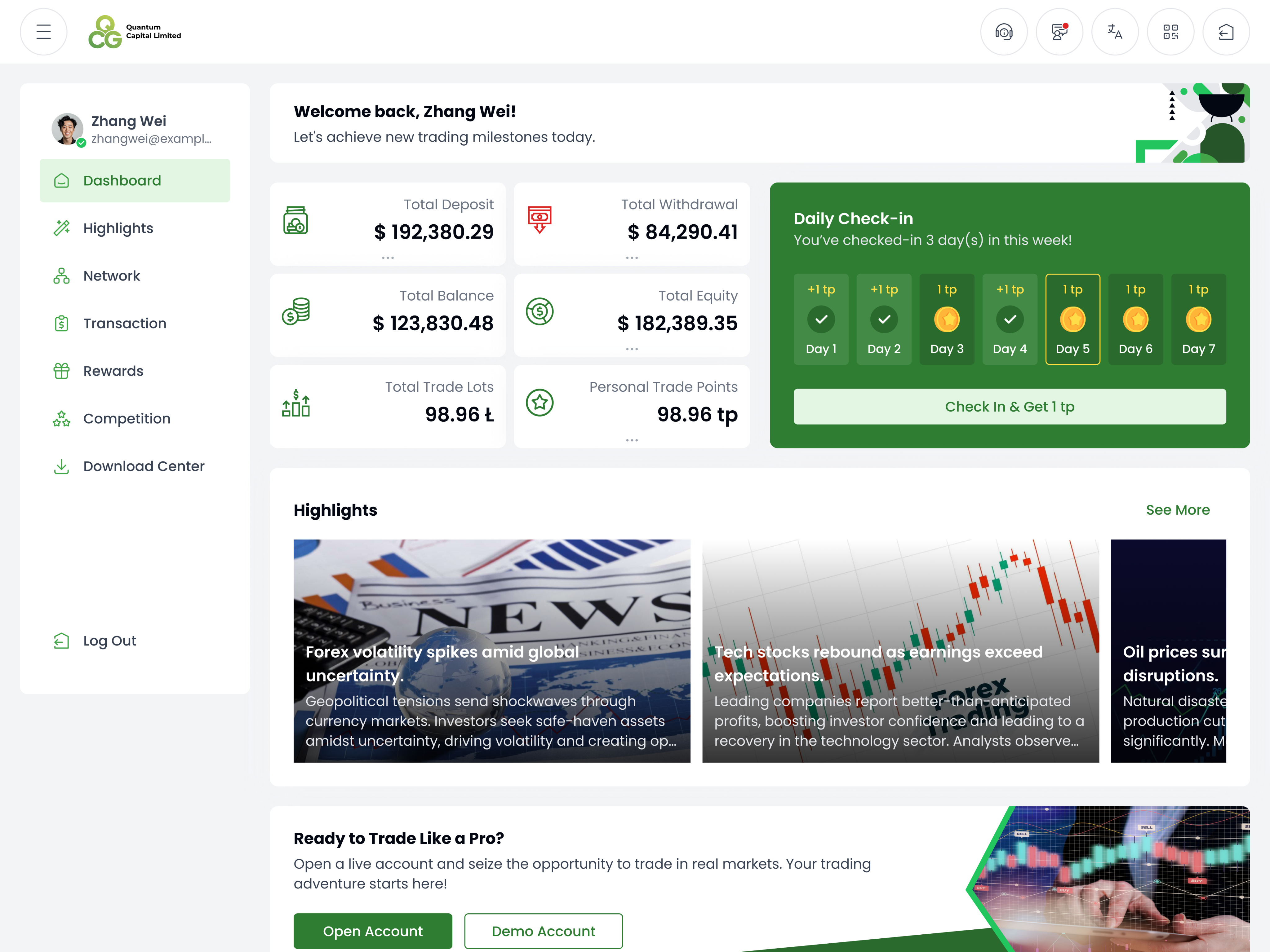No matter your experience level, QCG’s account options fit your trading goals. Begin with a demo account for safety or dive into a standard account and earn Trade Points for exclusive rewards.