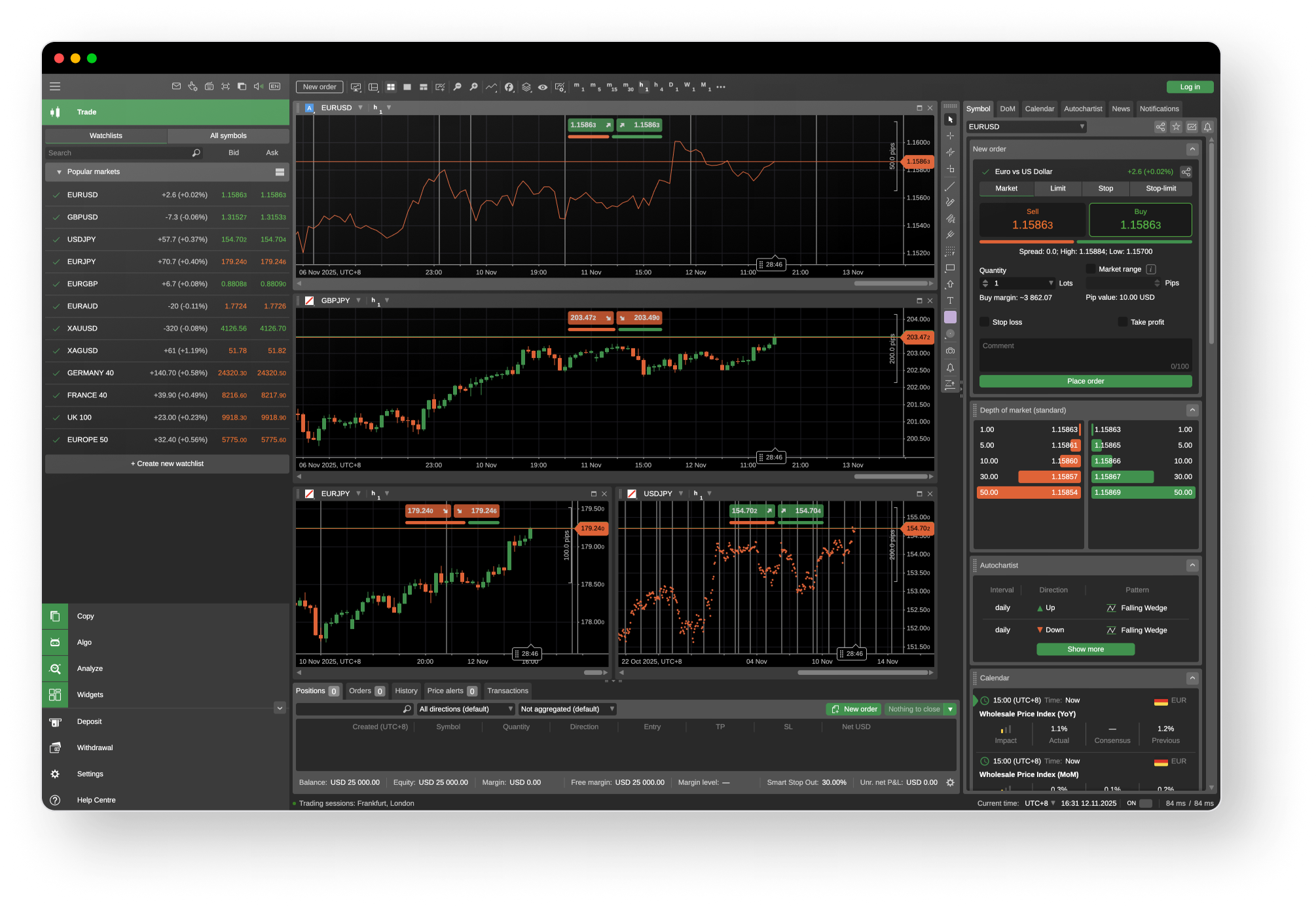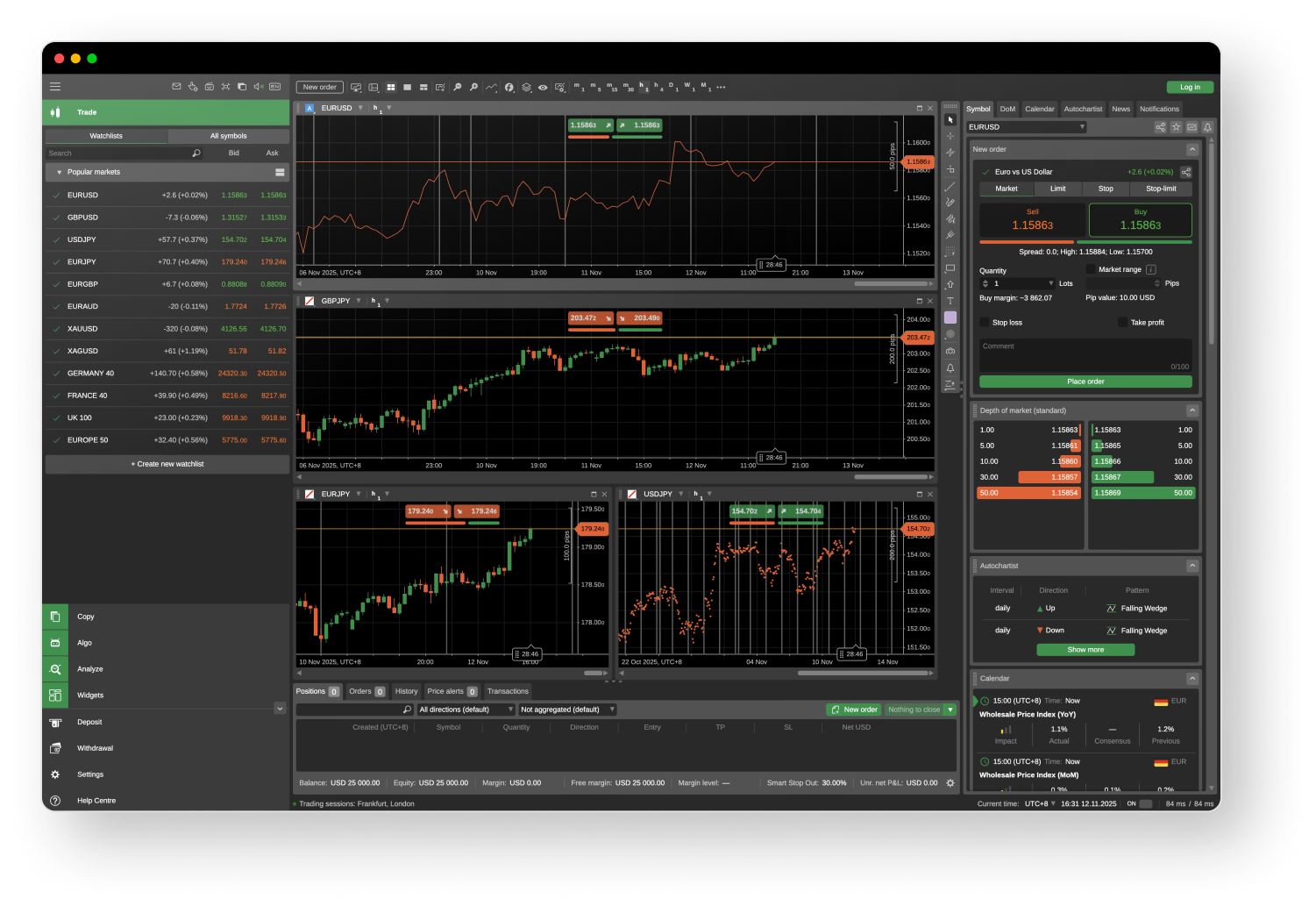 Analyze markets with intuitive charts, real-time depth of market, and customizable layouts.